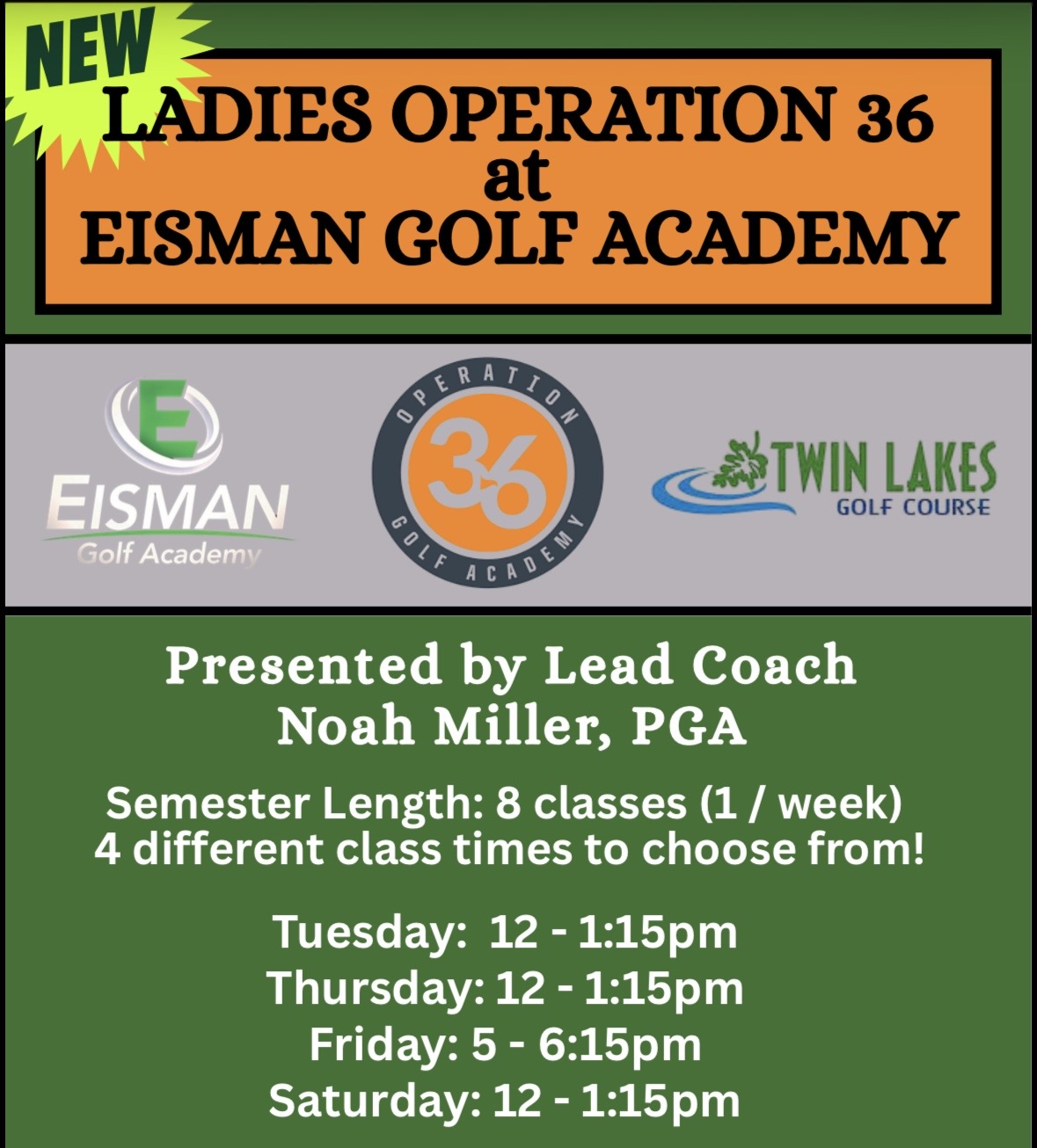 Golfers, beginner or experienced alike choose which class they would like to join. Each week PGA Coach Noah Miller will conduct class on that week’s topic - ensuring you are educated on the skills you will need in your game.