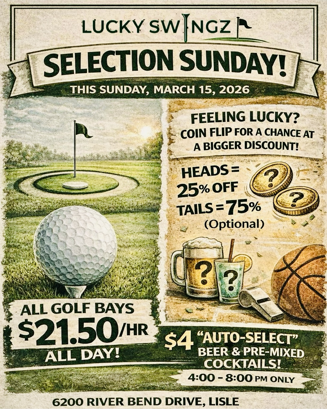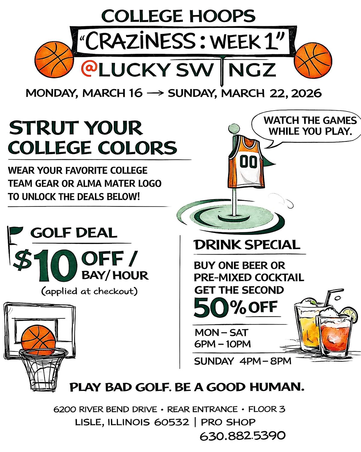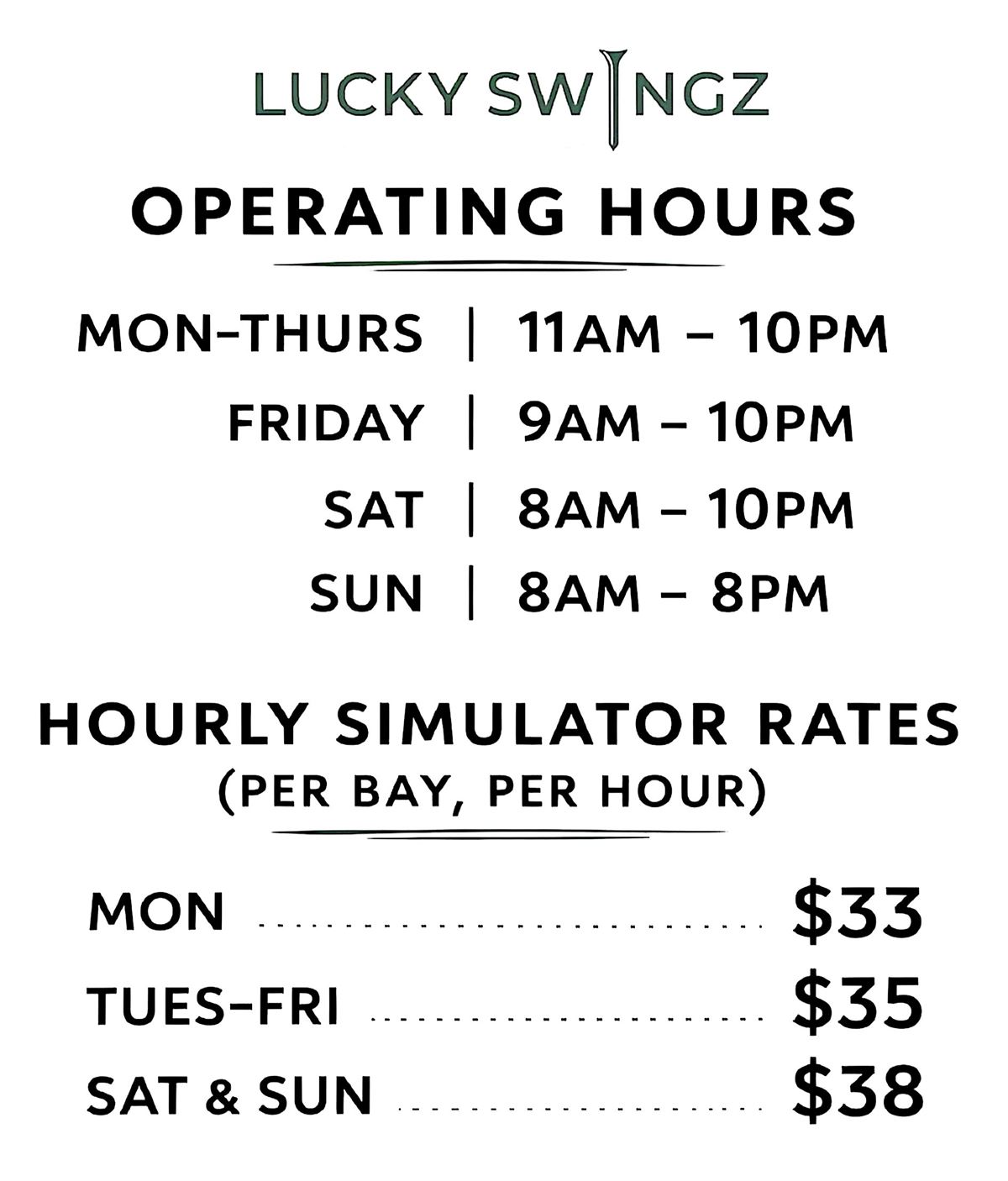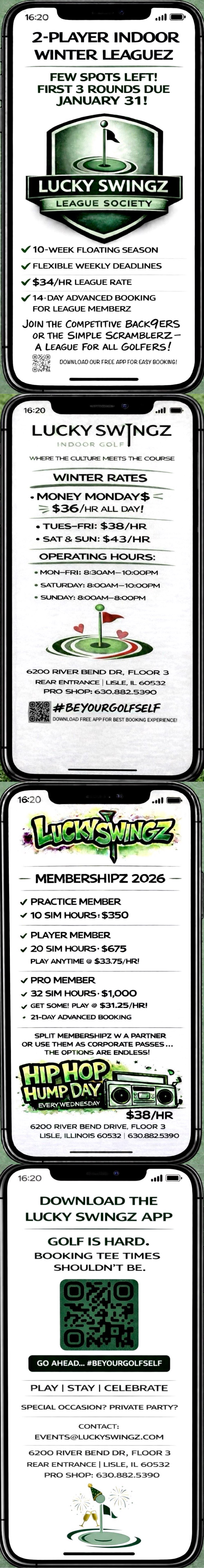 Cancellations: With 12+ hrs notice, login to your Lucky Swingz Account & navigate to "Appointments" in dropdown menu. To cancel within 12 hrs of your tee time, call Lucky Swingz @ (630) 882-5390 & leave a message!