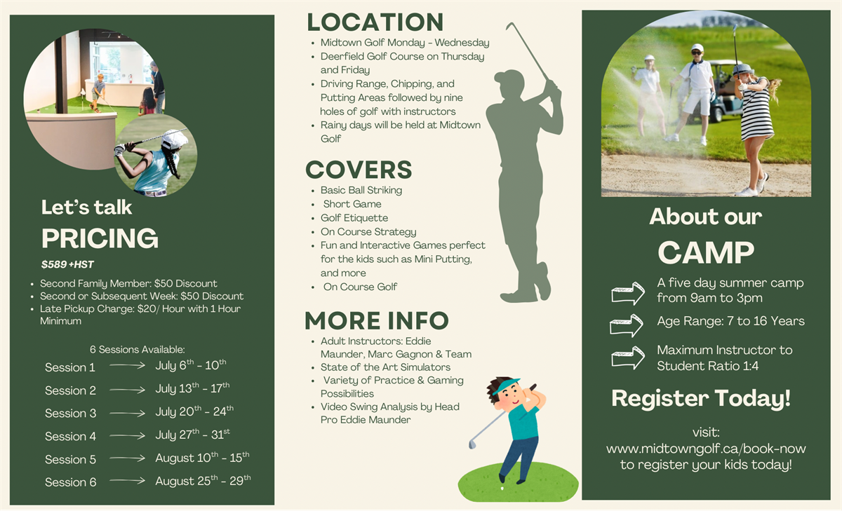 Midtown Golf Summer Camps are the perfect way for kids ages 7–16 to learn, play, and fall in love with golf. Our 5-day camps (9am–3pm) combine indoor training at Midtown Golf’s state-of-the-art simulators with outdoor instruction at Deerfield Golf Course, giving campers the best of both worlds. Using the proven Operation 36 development program, kids learn ball striking, short game, etiquette, and on-course strategy while playing fun games and real golf.