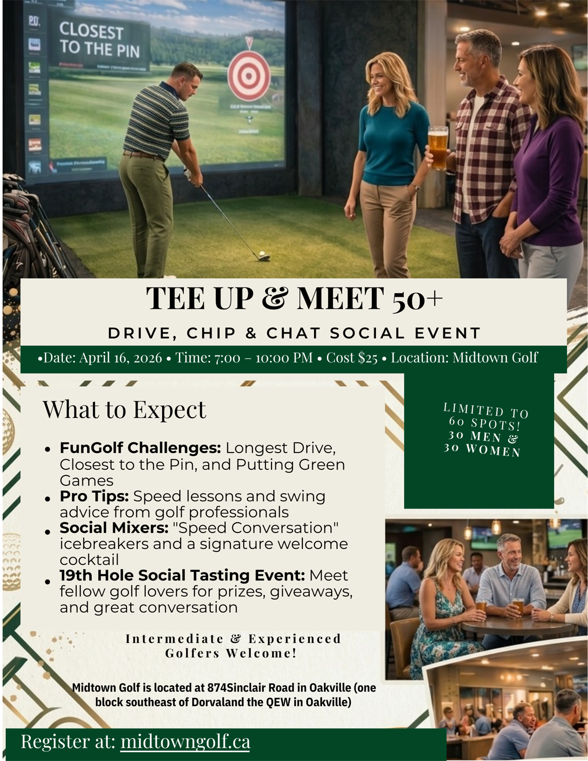 Tee Up & Meet 50+ – Drive, Chip & Chat Social is a fun, relaxed golf social for adults 50+ looking to meet new people who love the game. Enjoy simulator challenges like Longest Drive and Closest to the Pin, quick pro tips from golf professionals, and a lively 19th Hole social with drinks, prizes, and great conversation.