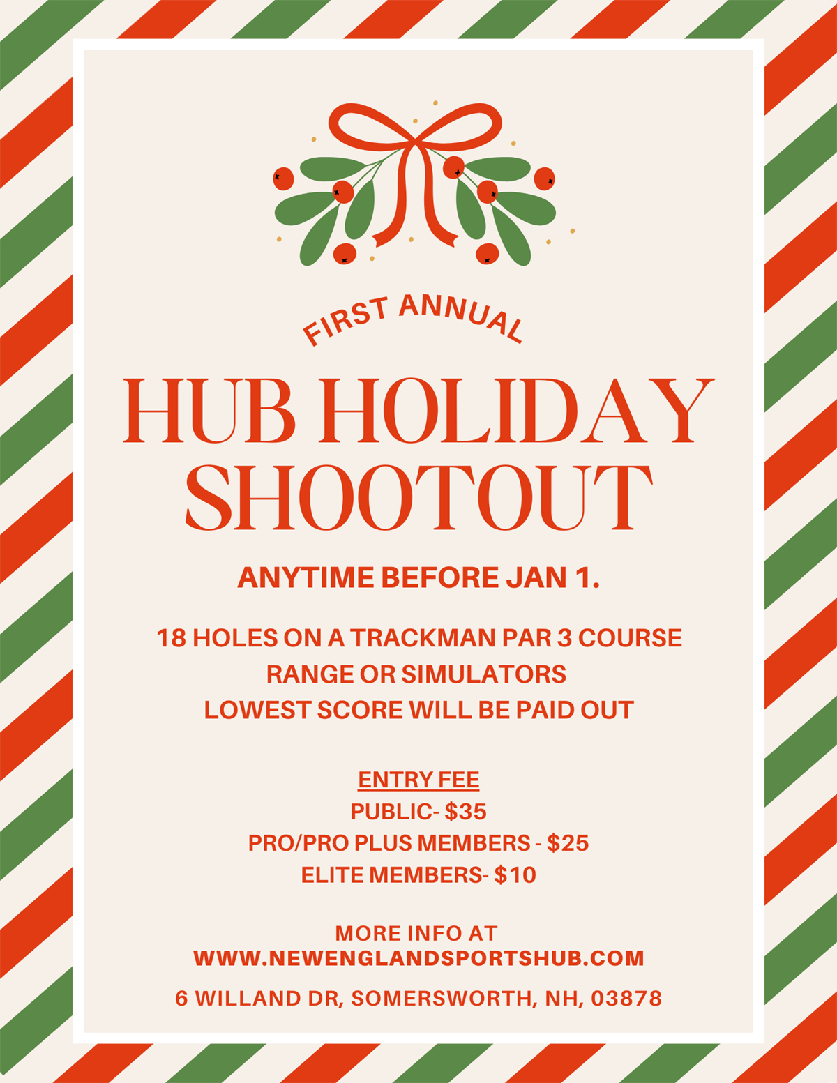 The Hub Holiday Shootout is a festive 18-hole golf challenge held anytime during December on a TrackMan par-3 course. Players of all skill levels compete in a fast-paced, simulator-based event, making every shot count on tight, precision greens. It’s a perfect way to bring holiday cheer and friendly competition together—no winter weather worries, just golf, fun, and community spirit.
