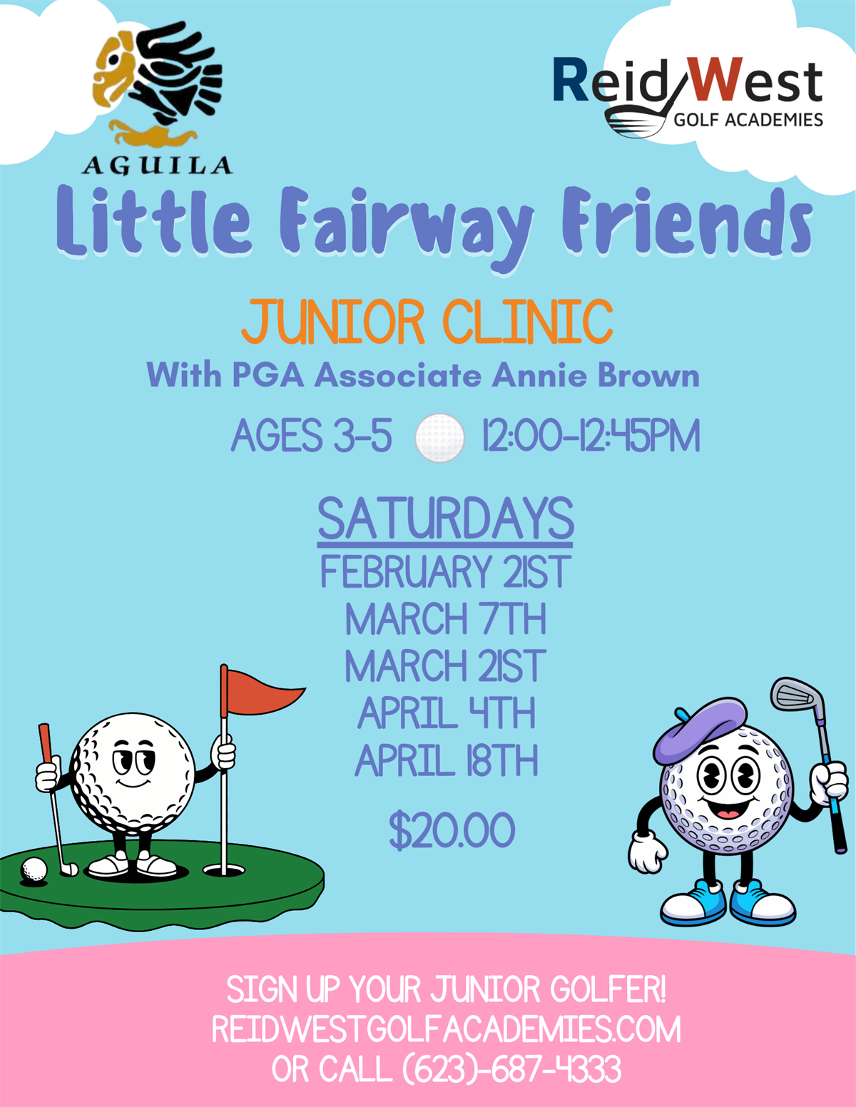 Little Fairway Friends is a fun golf clinic for ages 3–5 that introduces the basics of golf through games, movement, and smiles on the 1st & 3rd Saturday of the month at Aguila Golf Course.
