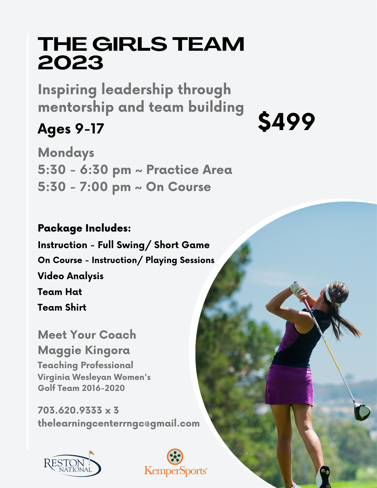 Designed for girls who want to start their golf journey. Perfect for ages 9-13. The format is guided towards good etiquette, proper practice routines, drills specific to each player, positive attitudes, and goal setting. Girls will receive on course situational instruction along with time at the practice areas improving their full swing and short game technique. Girls will learn how to prepare for high school golf, local competitions, or just their casual round on the course in a welcoming team environment. This is a great way to learn new skills, work on your golf game and make new friends.