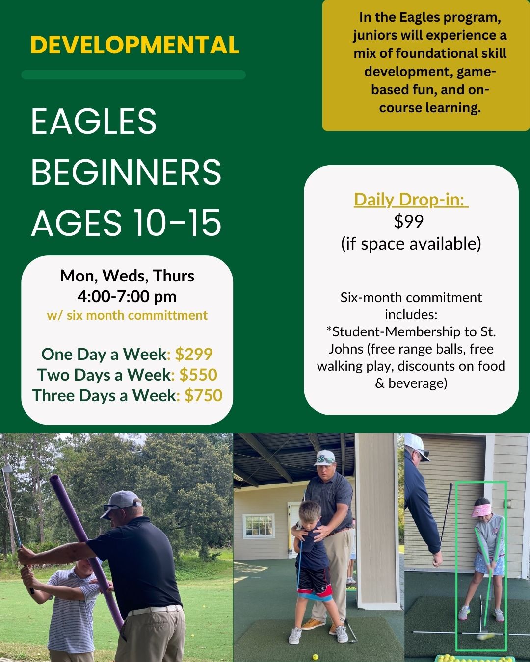 (Daily Enrollment) Eagles is offered Monday, Wednesday, & Thursday afternoons from 4:00-7:00 PM. In the Eagles program you will experience a mix of foundational skill development and on-course learning. Monthly one-two-or three-day a week options for beginner junior golfers ages 10-15. Six-month commitment includes a Junior Golf Membership to St. Johns Golf & CC and all of its perks.
