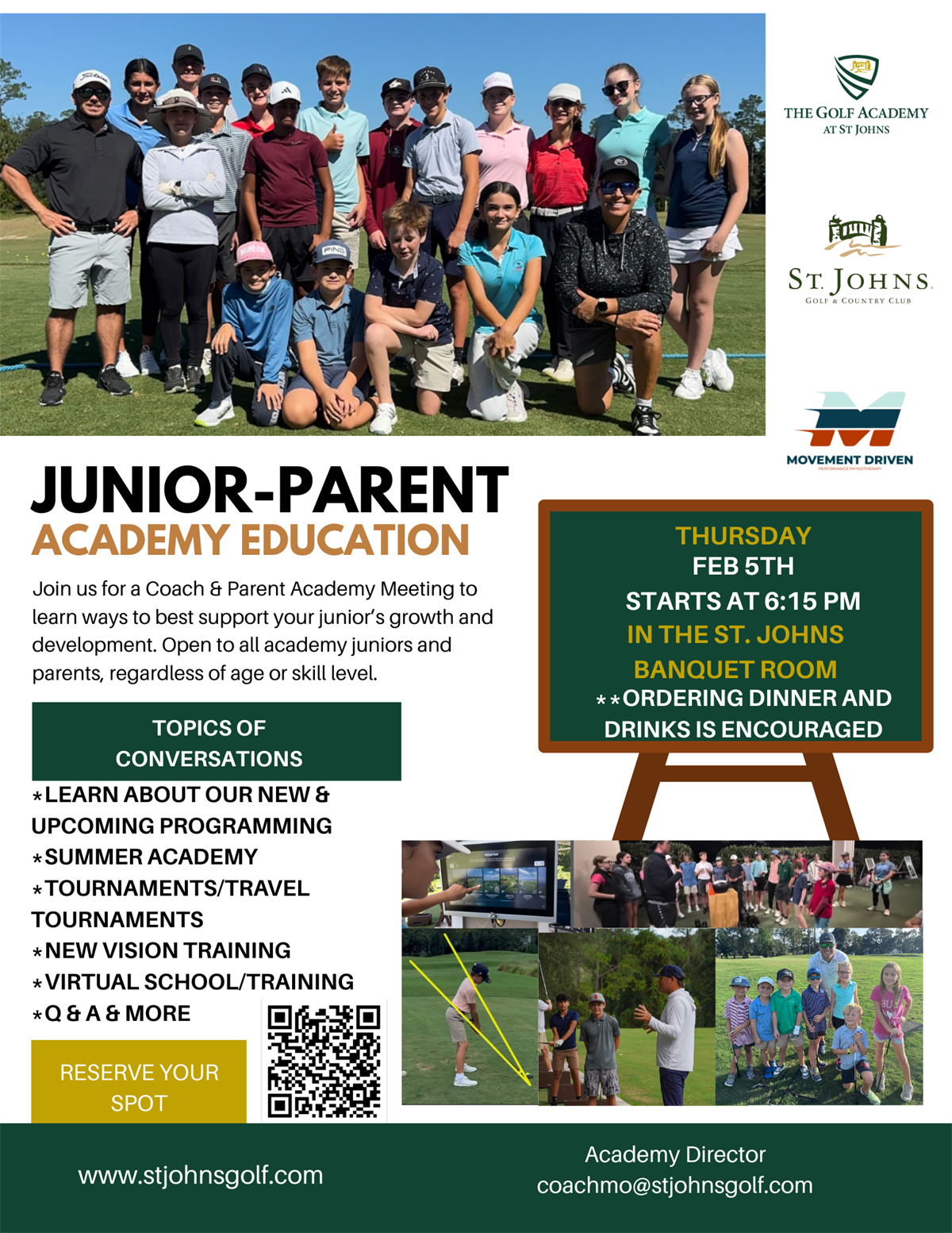 We invite all parents and juniors to join us for our Coach & Parent Academy Meeting on Thursday, February 5th at the Banquet Room at St. Johns at 6:15 pm to learn about new programming options, tournaments, vision training, summer academy, and virtual school options for our more advanced academy students.