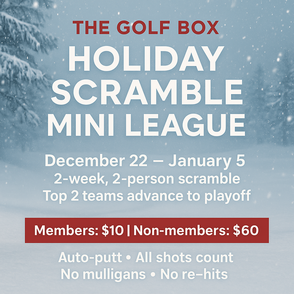 A 2-week, 2-person scramble mini league running December 22 through January 5. Teams book a two-hour session each week to complete their round, and all scores are recorded automatically. The top two teams advance to a final playoff on January 8. Auto-putt is on, all shots count, and no mulligans or re-hits are allowed.