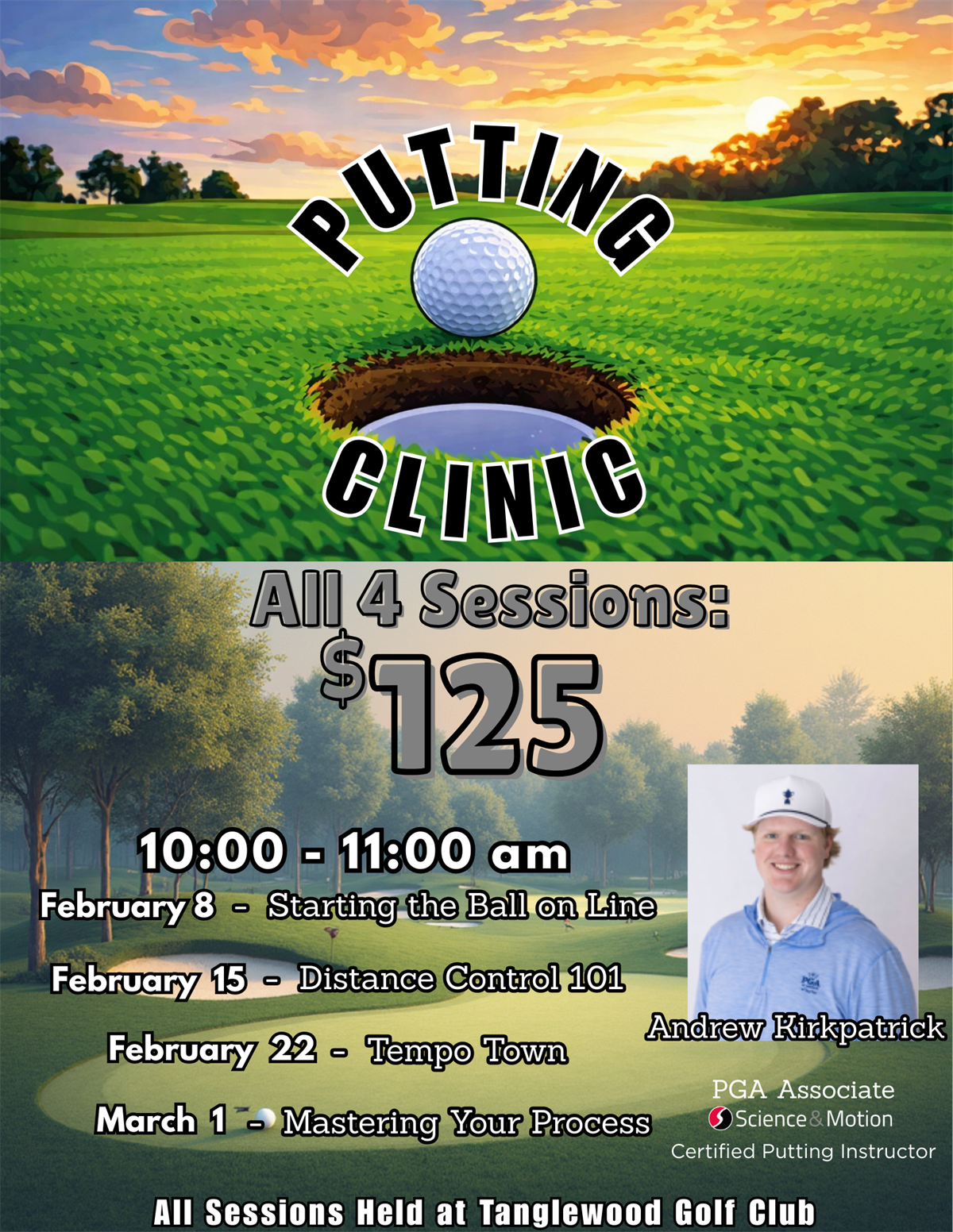 This 4-week putting clinic breaks putting down into clear, trainable skills that translate directly to the course. Players will improve how they start the ball, control pace, manage the putter face, and commit to a reliable routine. Each session builds on the last to create consistency under pressure and measurable improvement on the greens.