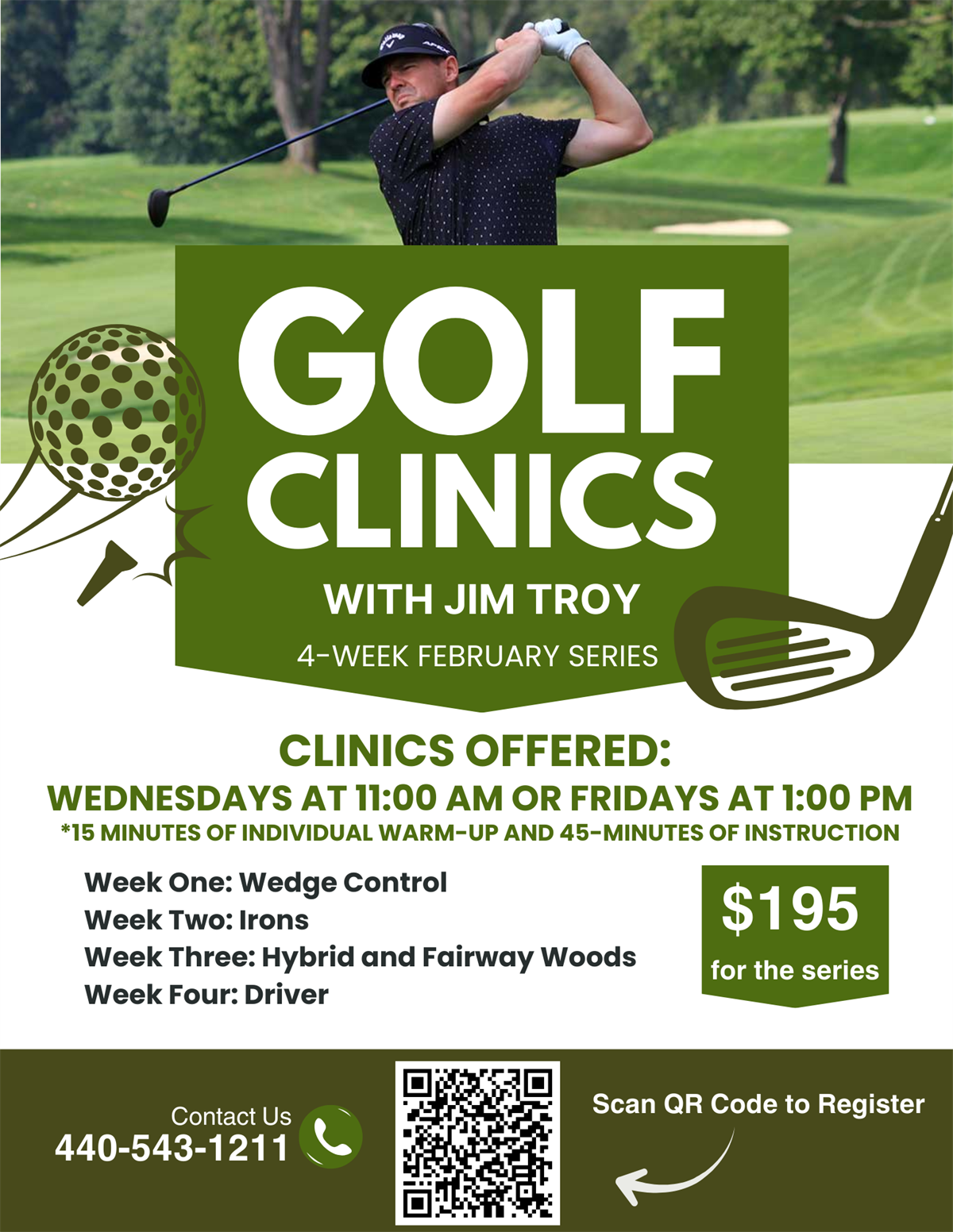 A four week clinic series taught by PGA Professional, Jim Troy. Each week there will be a different focus. Week 1 = Wedge Control, Week 2 = Irons, Week 3 = Hybrid & Fairway Woods, Week 4 = Driver. Total class time is 1 hour. First fifteen minutes is student warmup followed by 45 minutes of instruction. 4:1 ratio.
