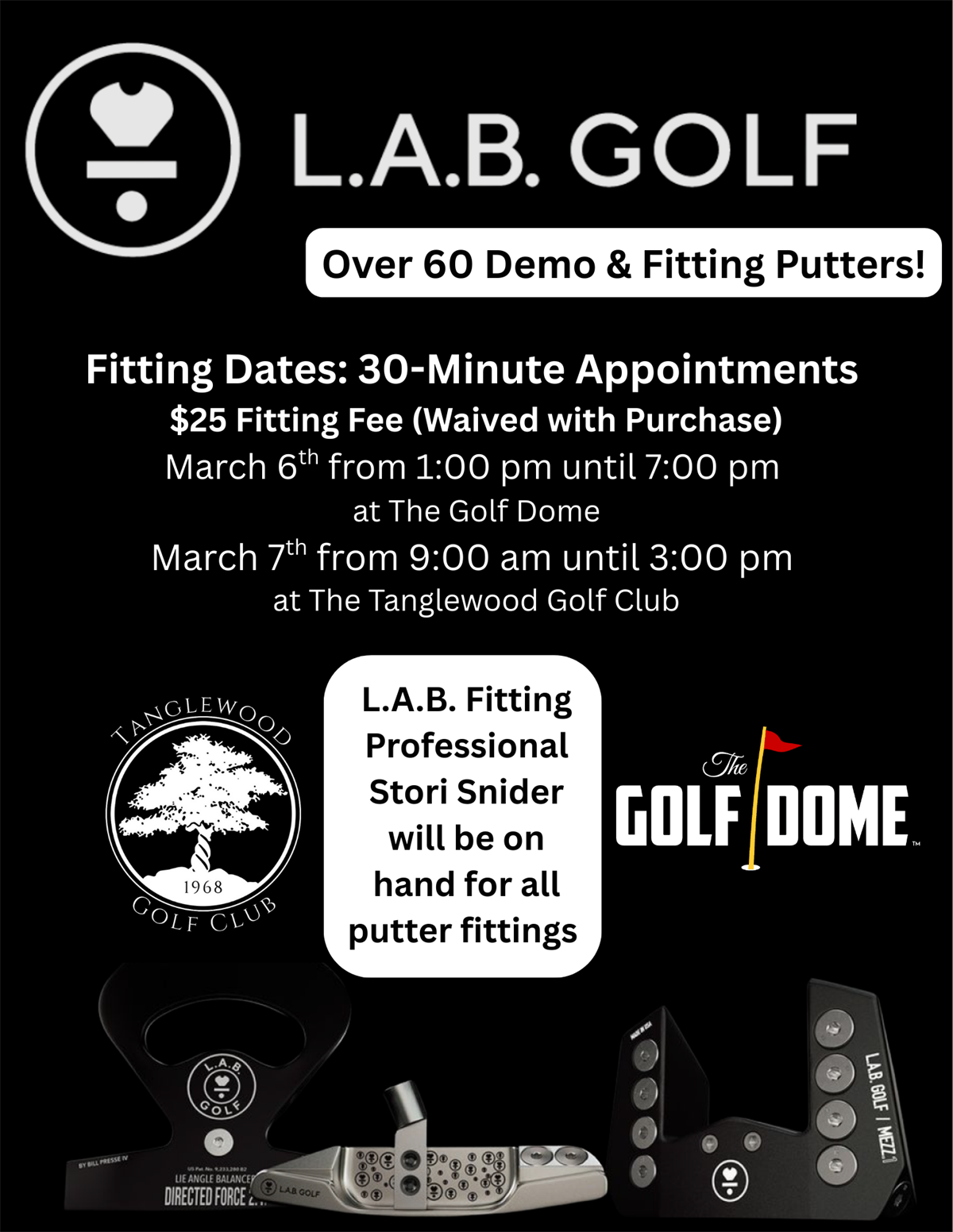 30 Minute L.A.B. Golf Fitting appointment. March 6th will take place at The Golf Dome and March 7th will take place at Tanglewood Golf Club inside of the Golf Shop. $25 fitting fee is credited towards any L.A.B. Golf putter purchase.